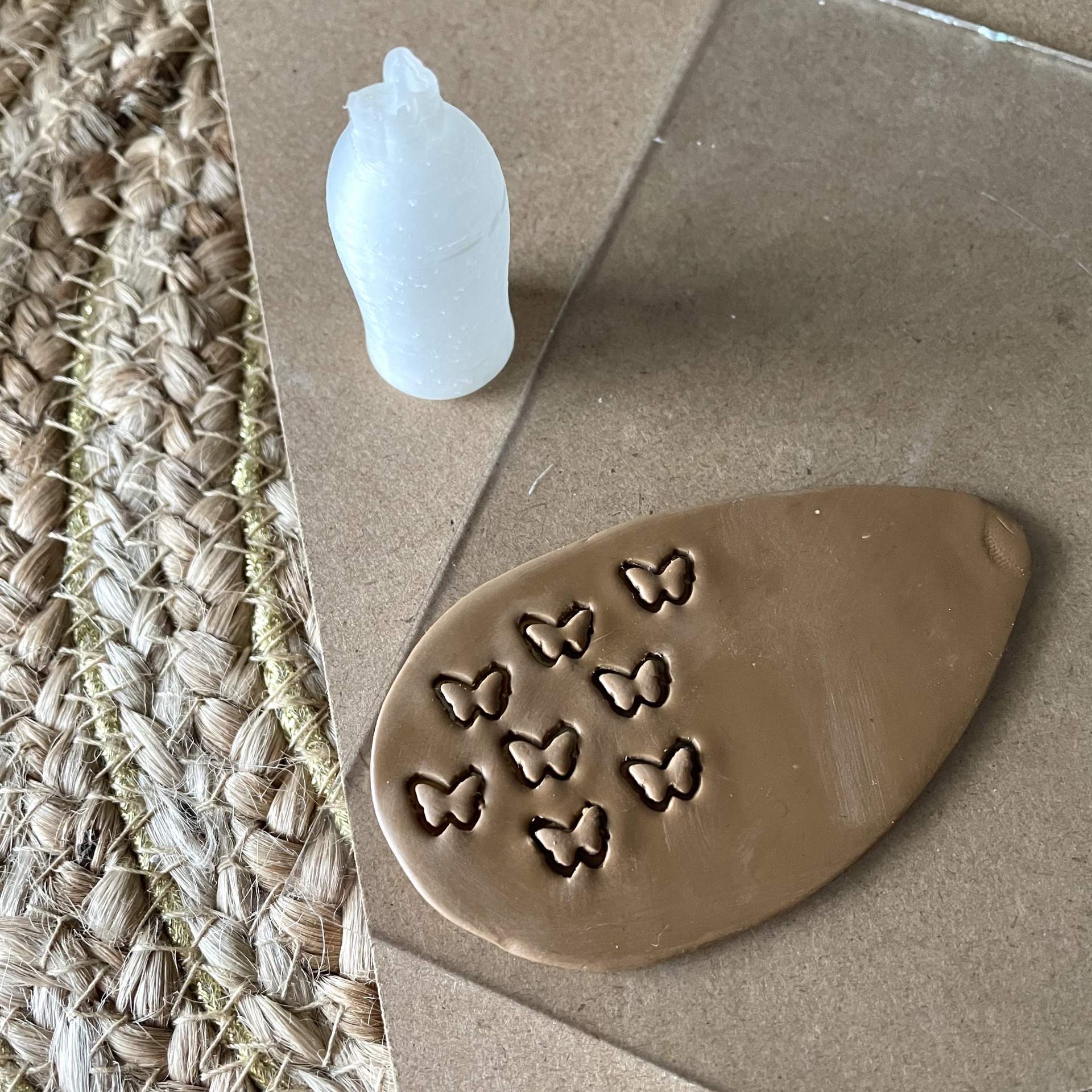 • Base plástica branca com relevo de borboletas e massa castanha com padrão de borboletas sobre cartão e ráfia.