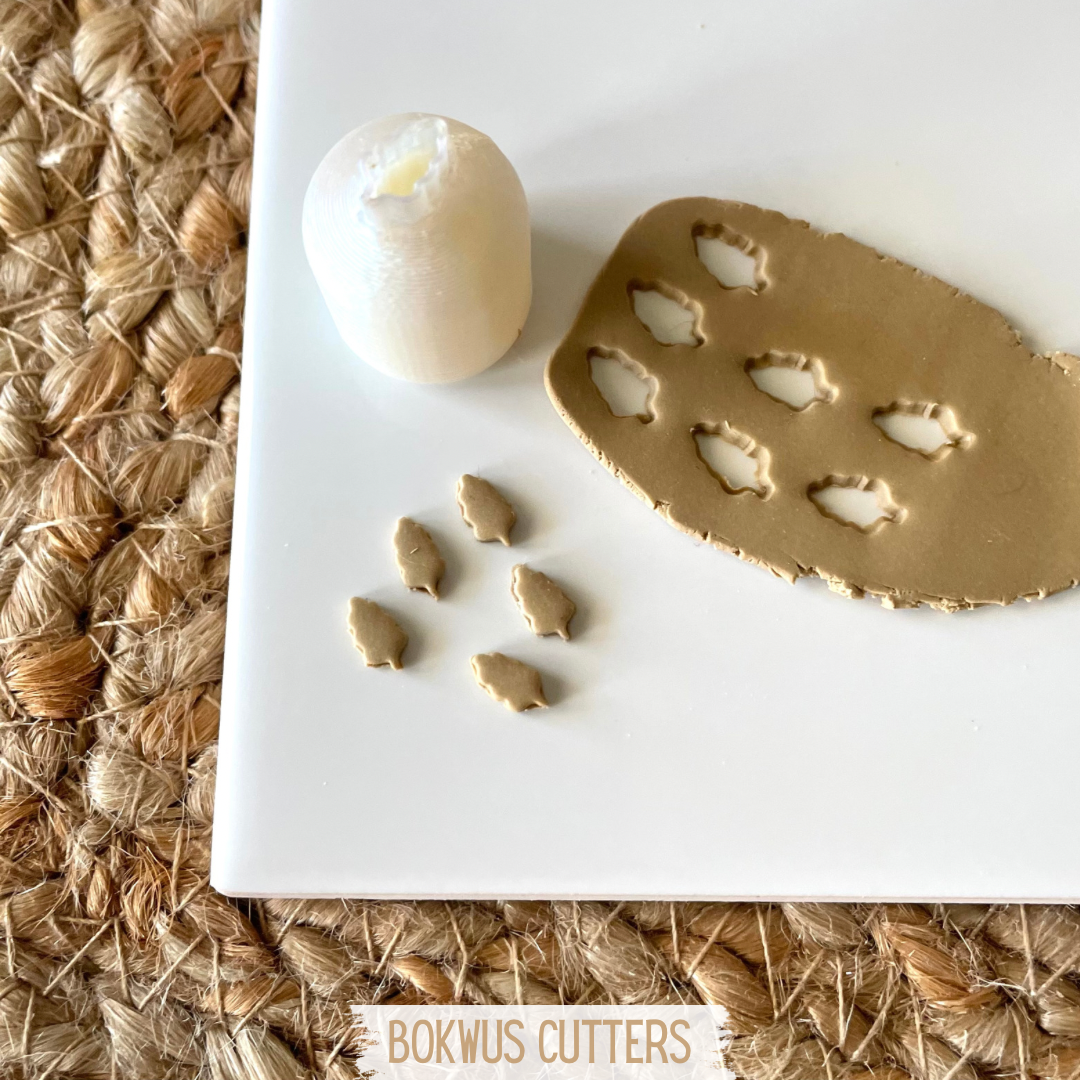 • Carimbo cortador em argila com recortes de folhas e vela branca sobre base branca com tapete de fibras naturais
