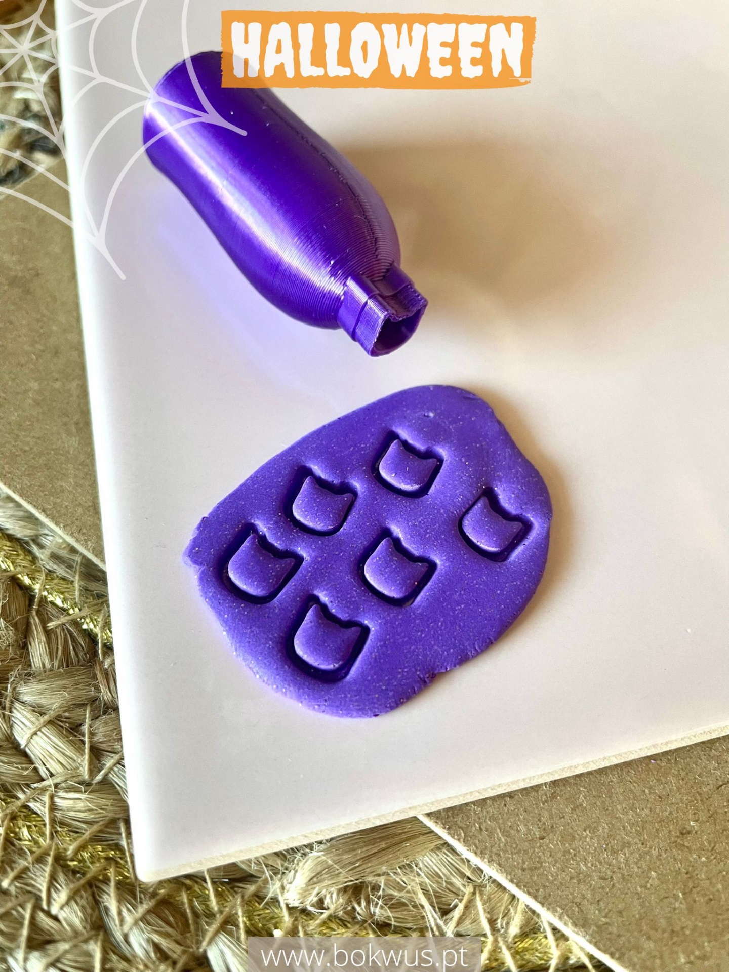 Carimbo roxo em forma de garrafa e massa de modelar roxa com marcas do carimbo sobre fundo branco com texto Halloween
