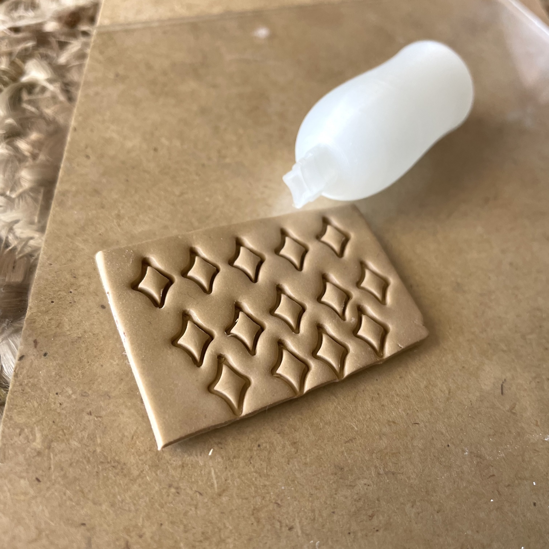 • Placa de massa bege com padrão de losangos e frasco plástico branco translúcido