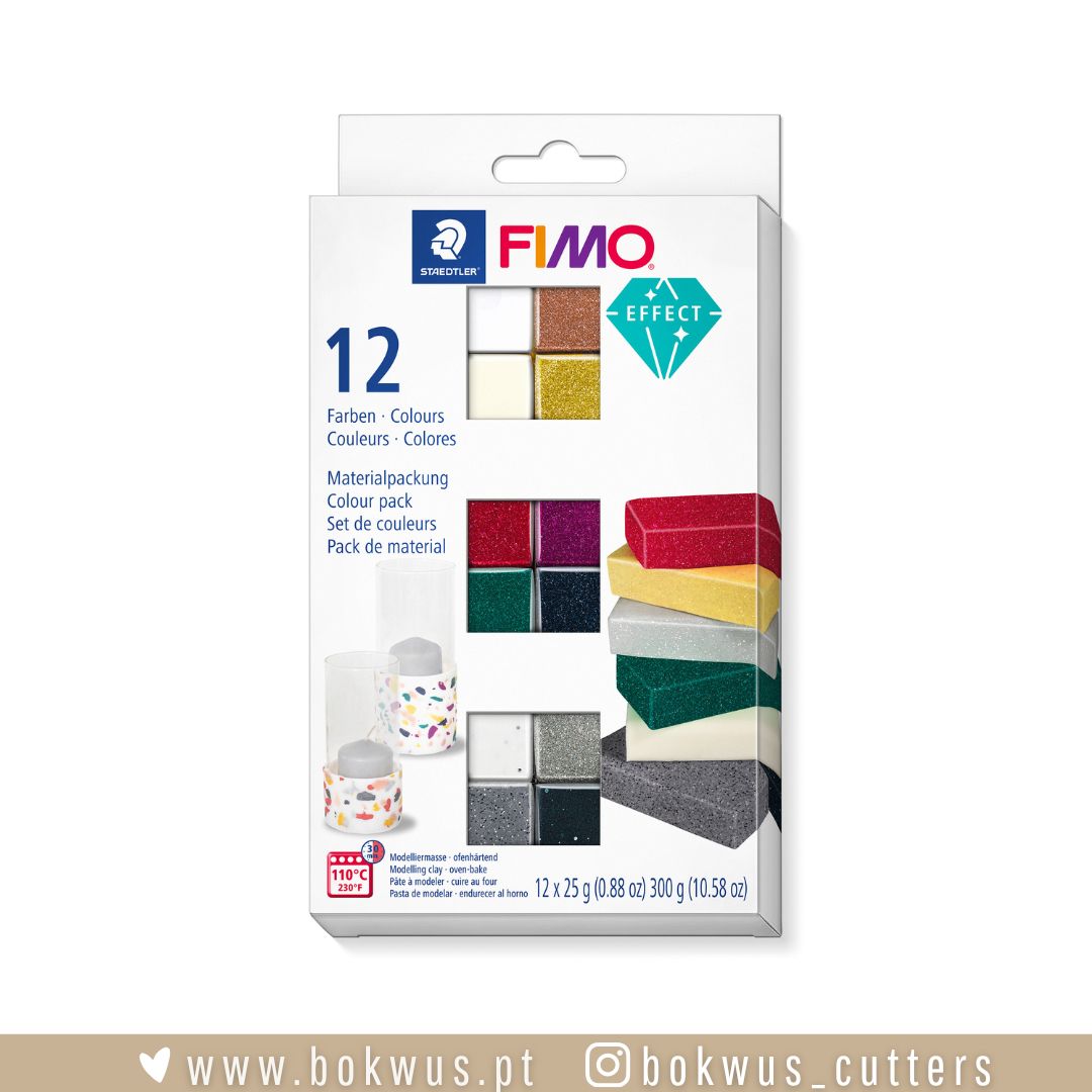 O pack FIMO Effect inclui 12 meios blocos de 25 g com cores da gama Effect — tons com glitter, metalizados, especiais e efeito pedra.
