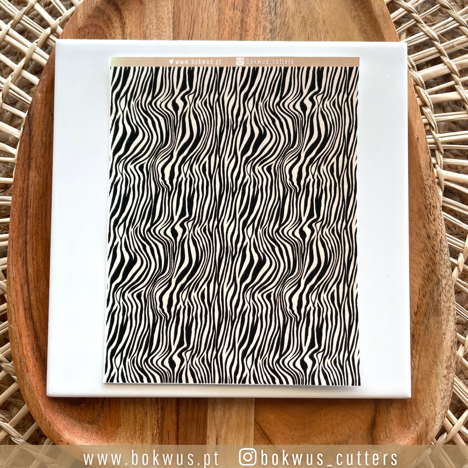 Faca decorativa com padrão zebrado sobre suporte branco e base de madeira