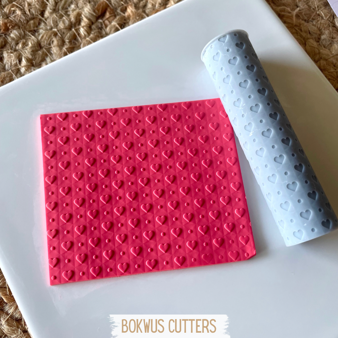 • Rolo e molde com padrão de corações em relevo sobre superfície branca