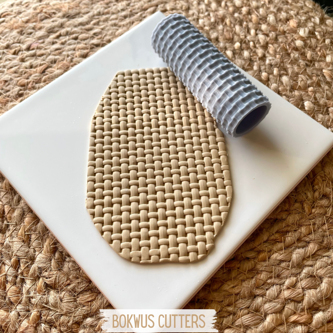 Texturizador manual de silicone cinzento com padrão de cestaria em pasta creme sobre base branca