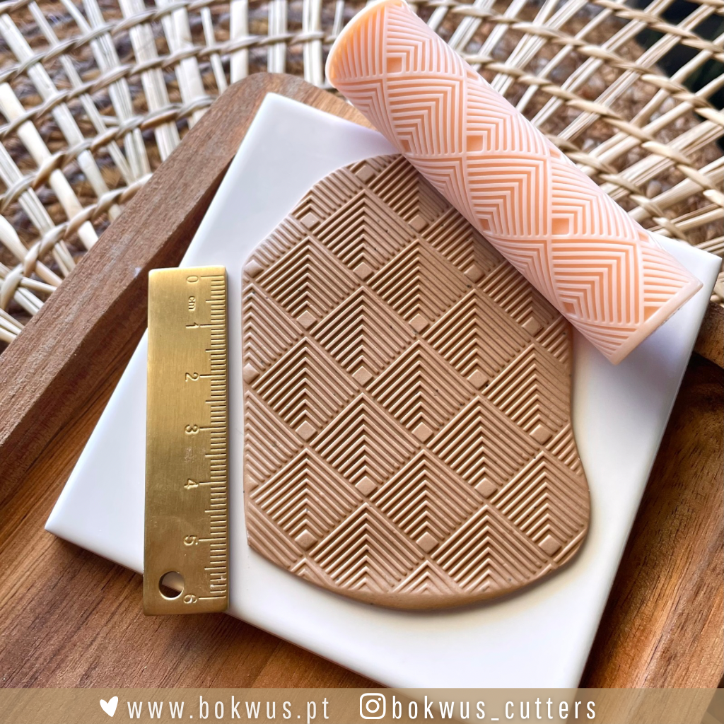 • Rolo de textura rosa e régua dourada sobre argila texturizada e prato branco e madeira
