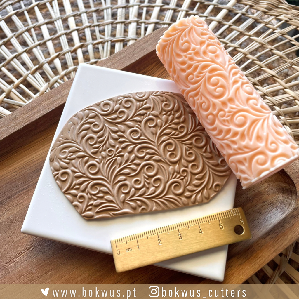 • Régua dourada, rolo de textura cor de pêssego, pasta modeladora marrom com padrão de folhas, base branca e tábua de madeira sobre superfície de rattan.