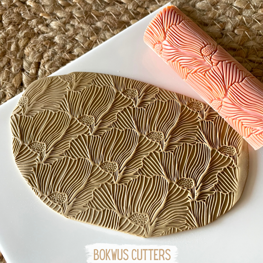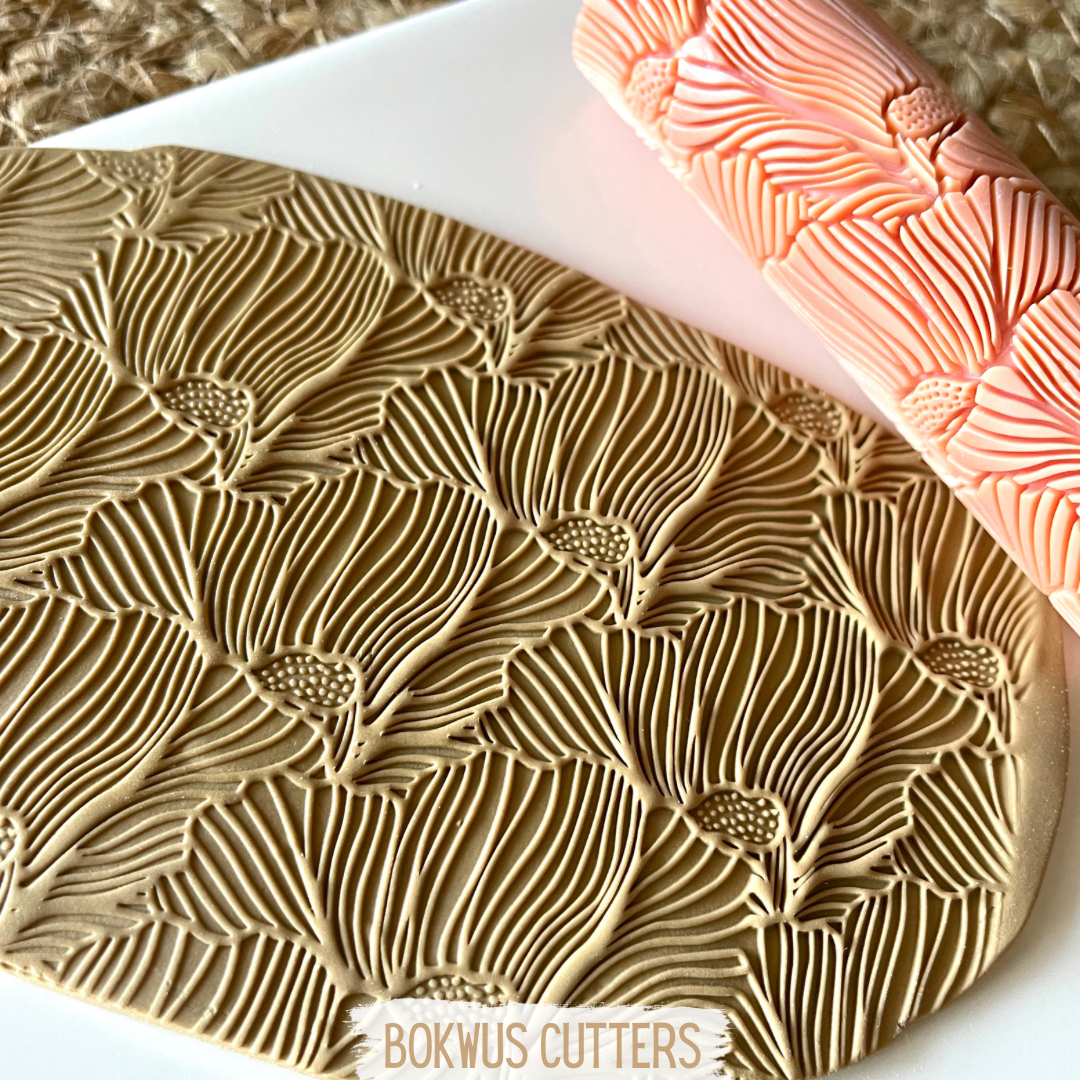 • Rolo de textura com padrão floral a criar impressão em argila marrom