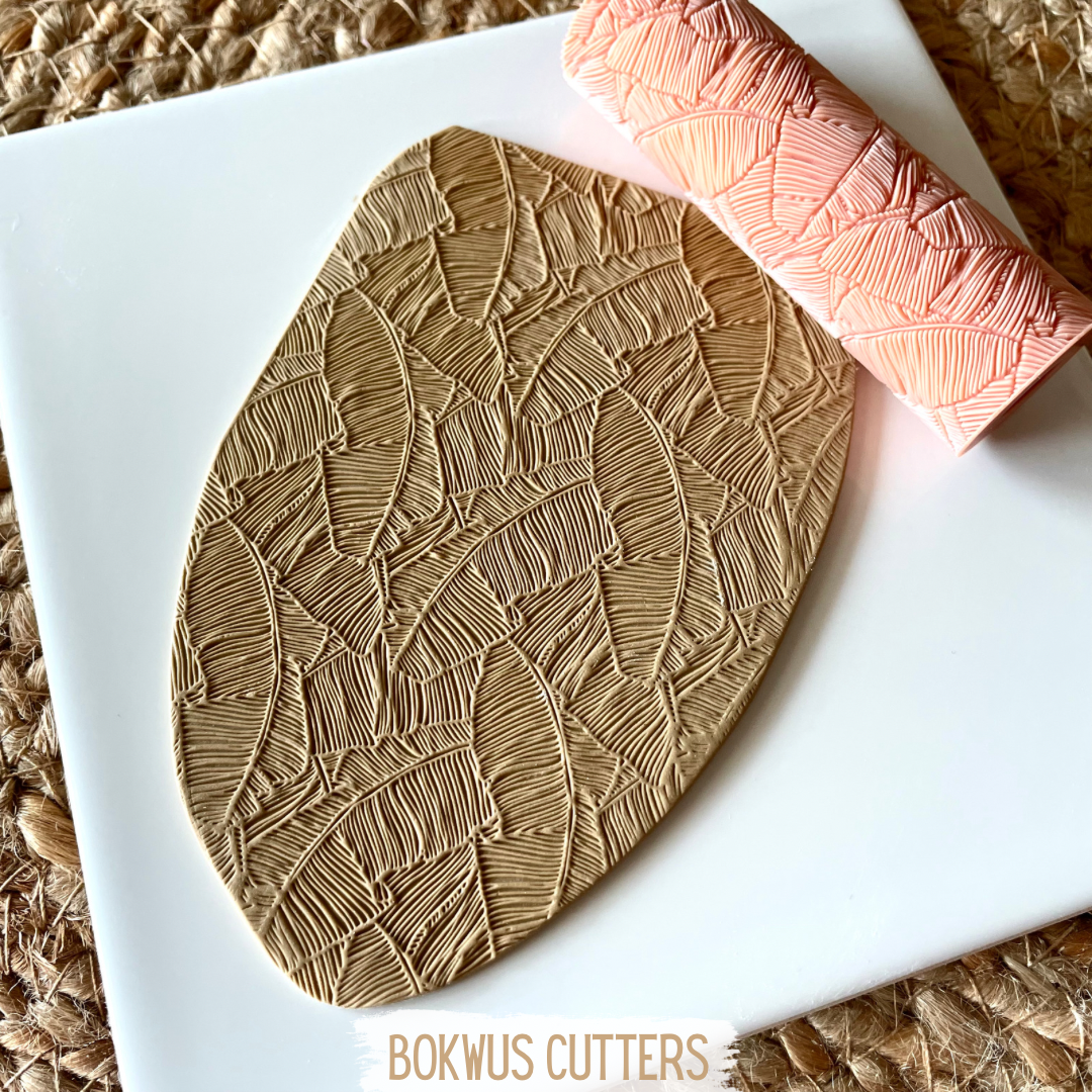 • Rolo texturizador cor-de-rosa com padrão de folhas e massa marrom clara estampada