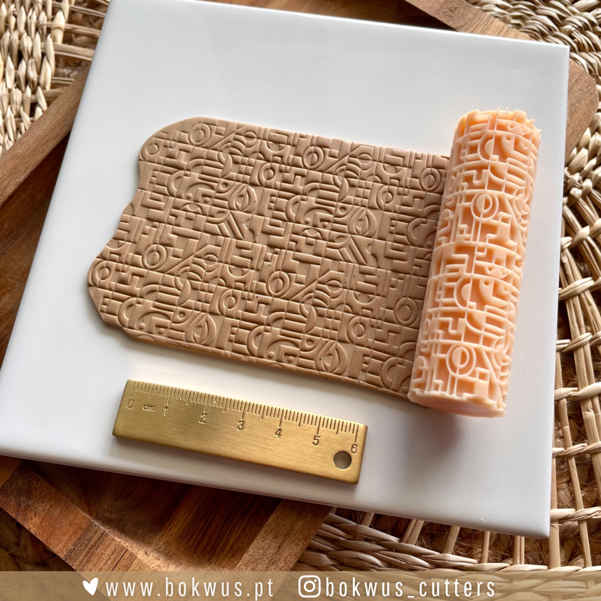 • Rolo de textura salmão com padrão geométrico sobre prato branco e régua dourada