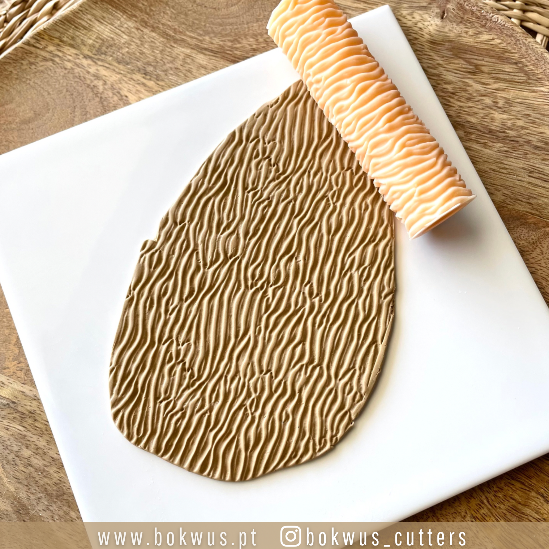 • Massa marrom clara com textura ondulada e rolo texturizador alaranjado sobre placa branca