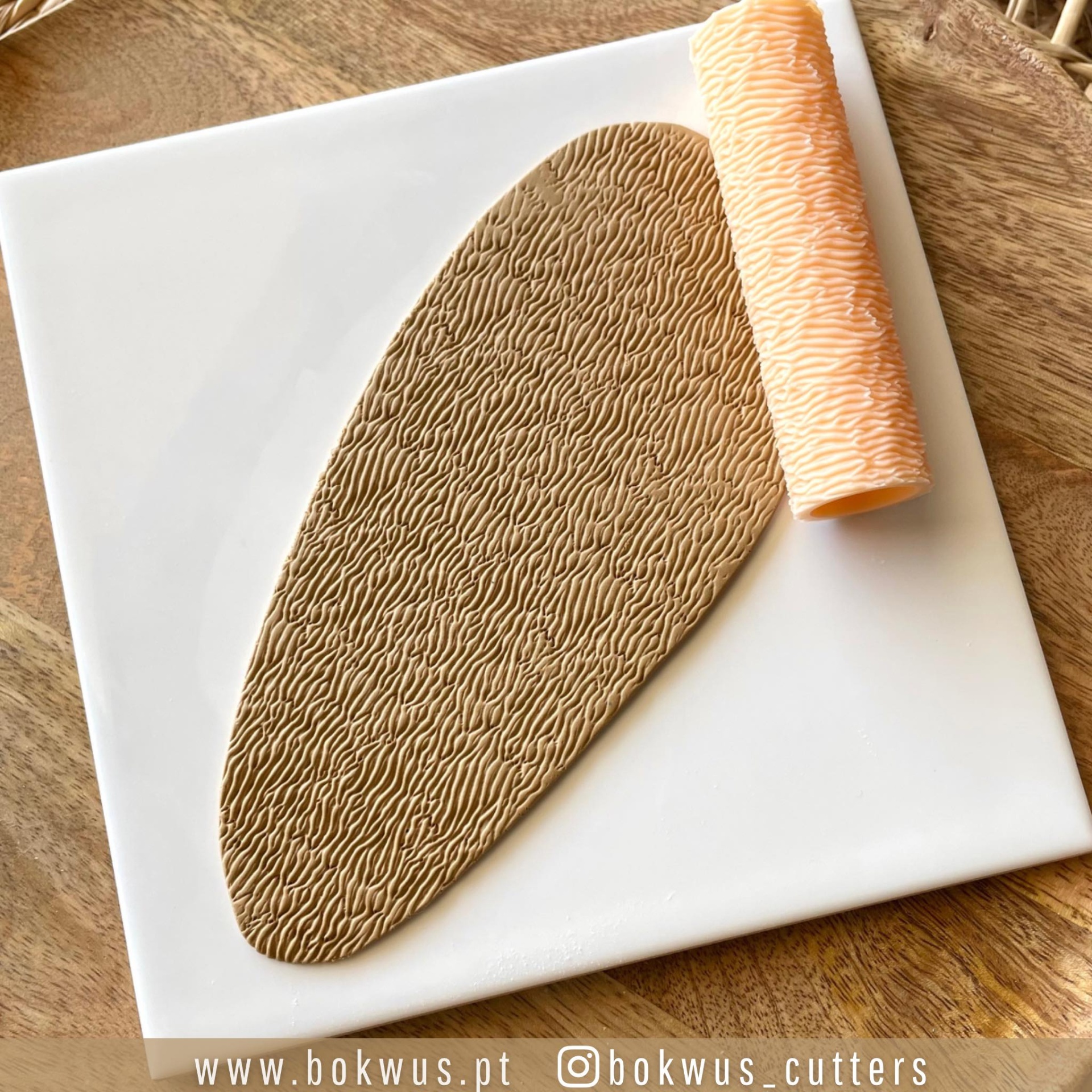 • Rolo texturizador laranja com padrão ondulado sobre massa castanha com mesma textura em placa branca