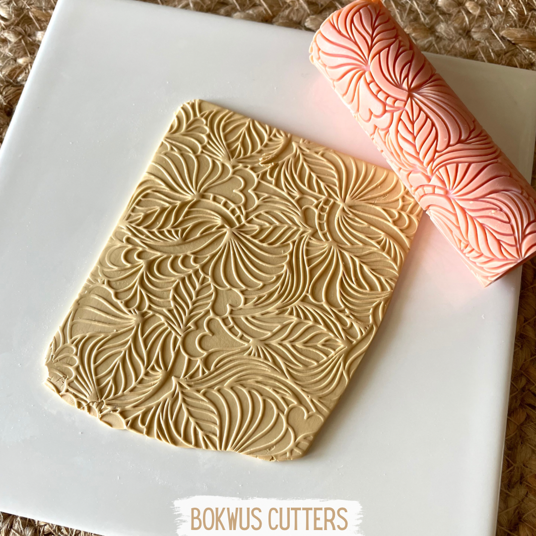 • Rolo de massa cor de salmão com padrão de folhas e massa estampada em branco