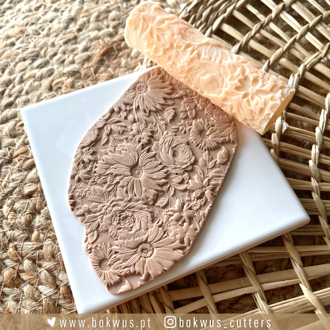 • Rolo de textura floral para massa sobre massa modelada e superfície de palha.