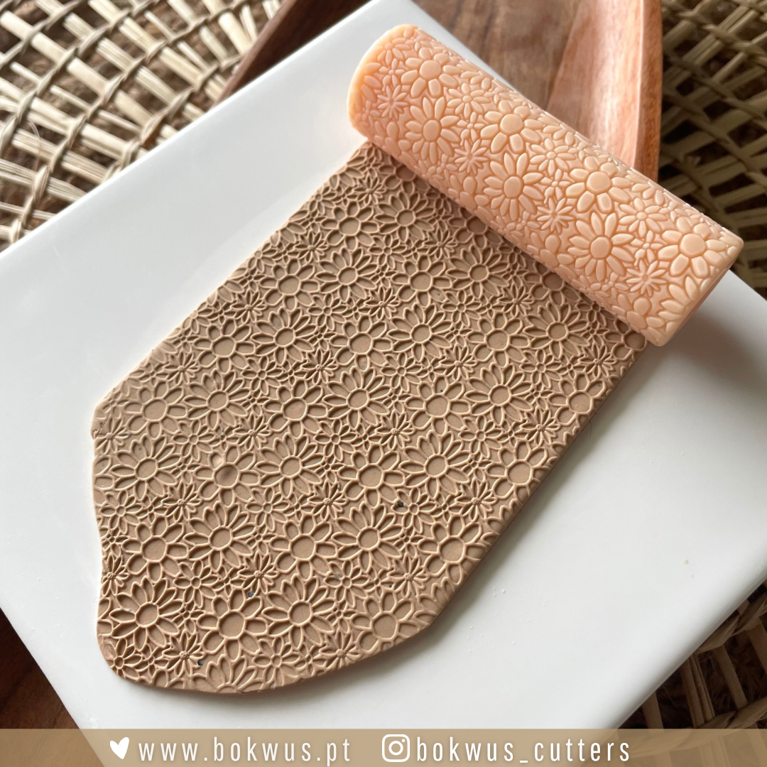 • Rolo de cozinha com padrão floral gravado em massa sobre um prato branco