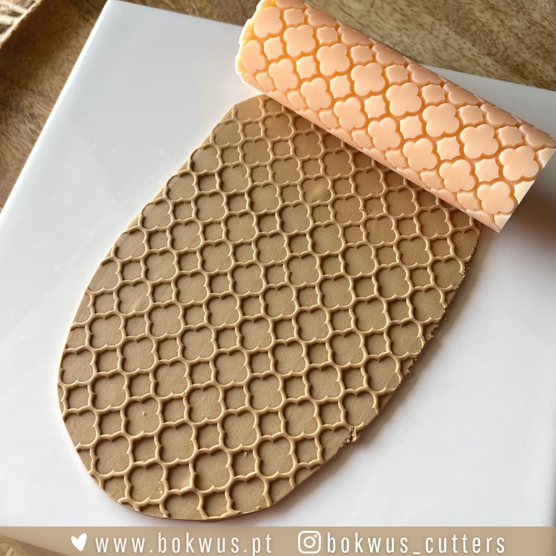 • Rolo texturizador de silicone cor-de-rosa claro com padrão de arabescos e massa marrom clara texturizada.