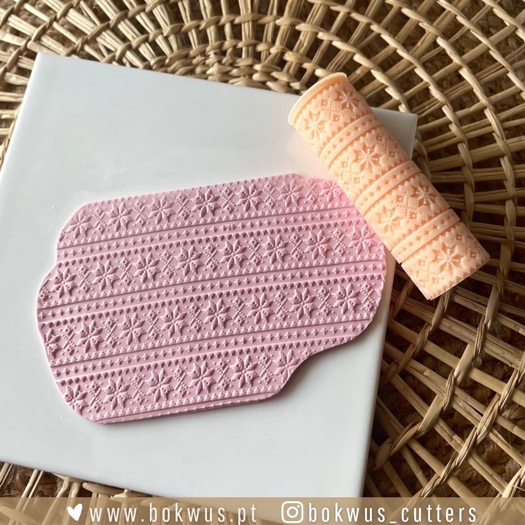 • Molde de silicone rosa texturizado e rolo alaranjado com padrão floral