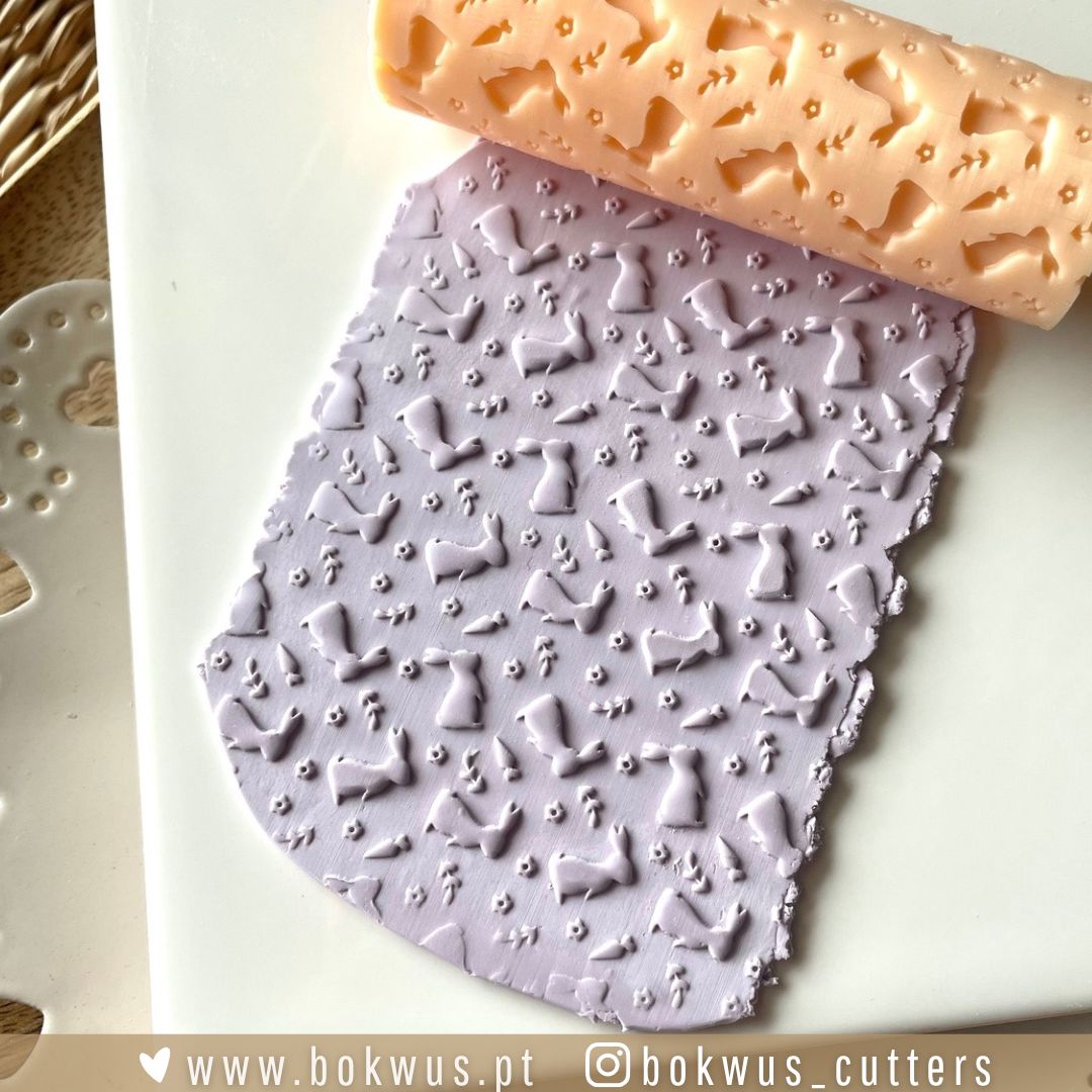 • Rolo de textura com padrões de ossos e patas de cães a imprimir em massa lilás