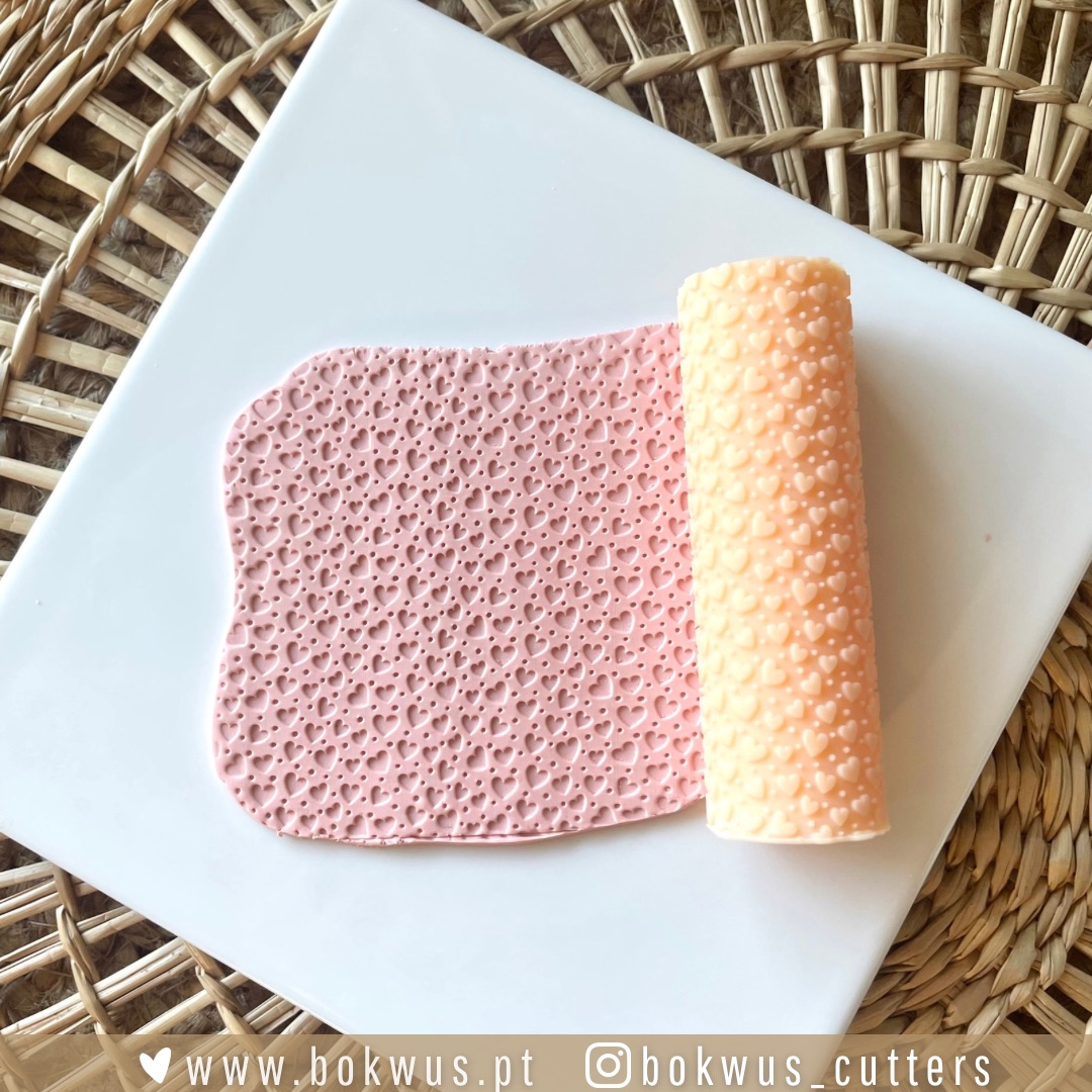 • Rolo de silicone texturizado cor pêssego sobre superfície plana branca com padrão em rosa claro