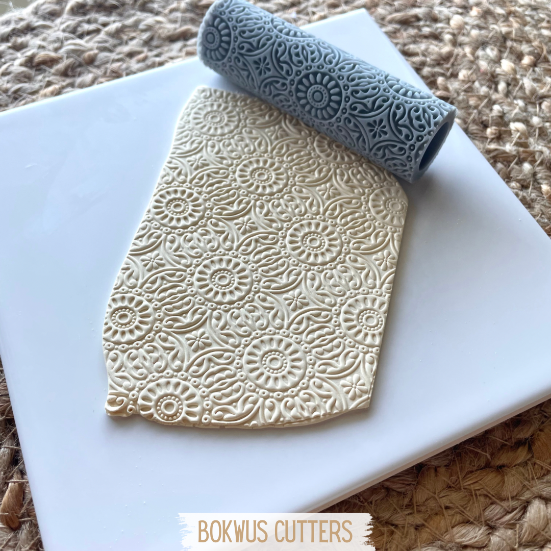 • Rolo de texturização cinzento com padrão floral e peça de barro estampada sobre placa branca