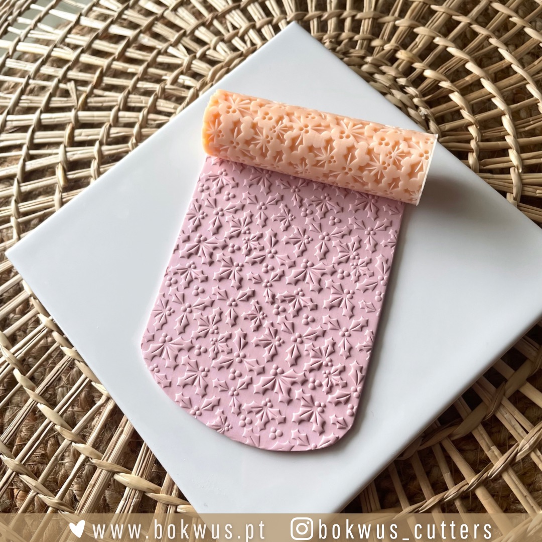 • Rolo texturizador rosa coral com padrão floral sobre superfície branca e fundo de cesto natural