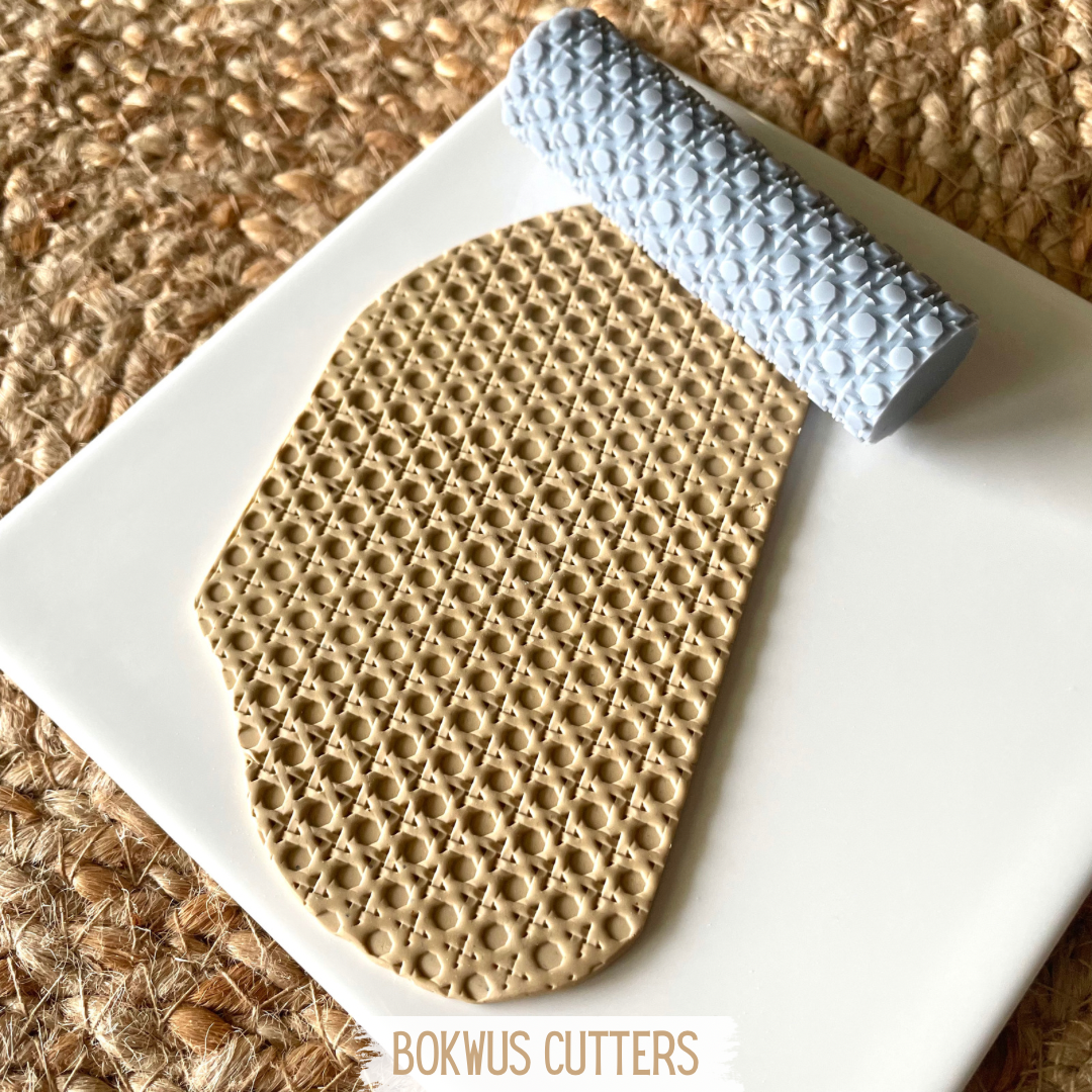 • Rolo texturizador azul claro com padrão geométrico e massa modelada bege sobre placa branca