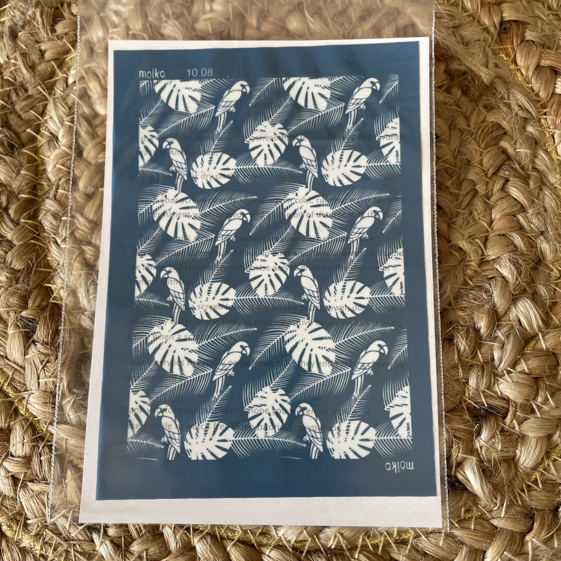 • Cartão com padrão de papagaios brancos e folhas sobre fundo azul, sobre superfície trançada