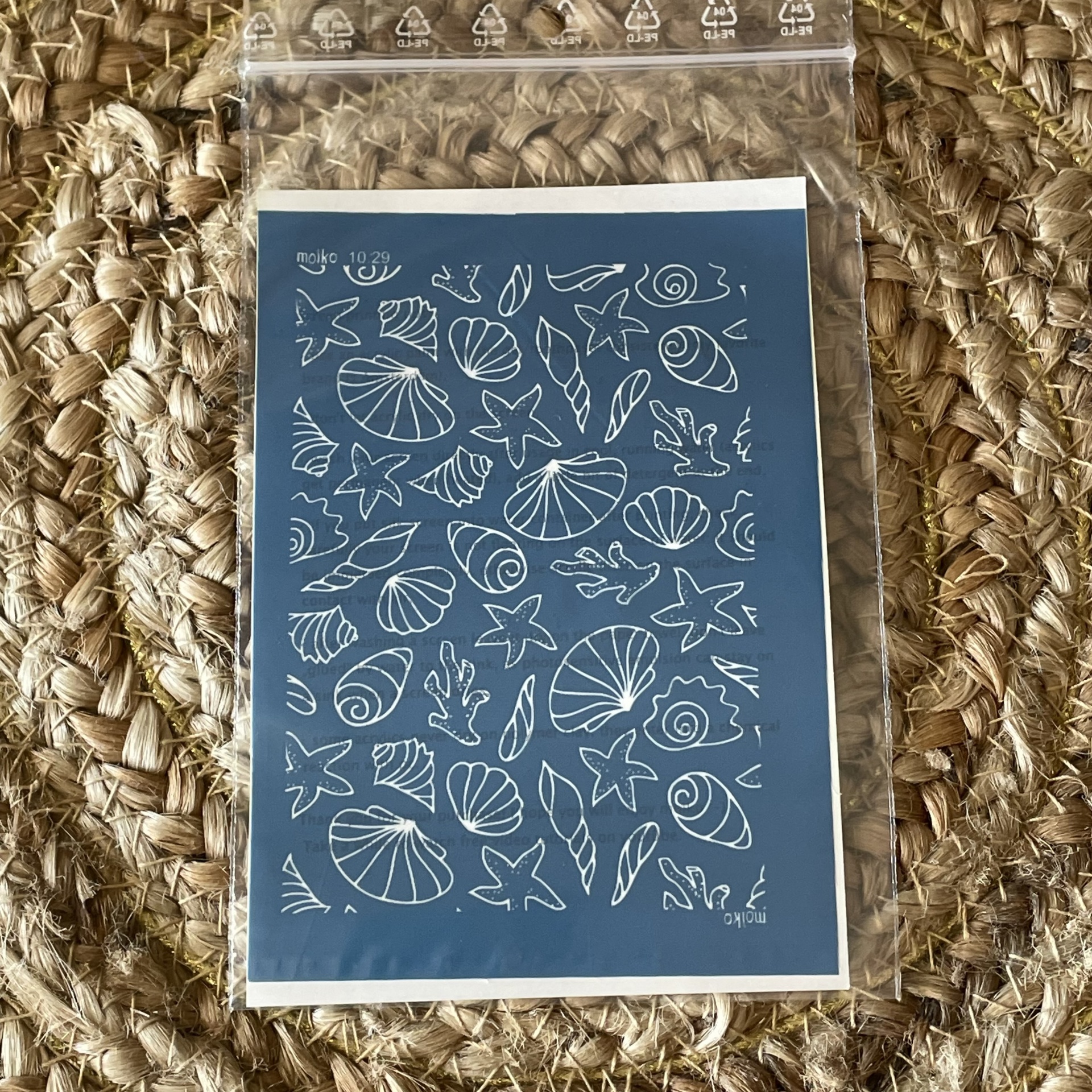 • Cartão azul com desenhos brancos de conchas em saco plástico sobre tapete de fibras naturais