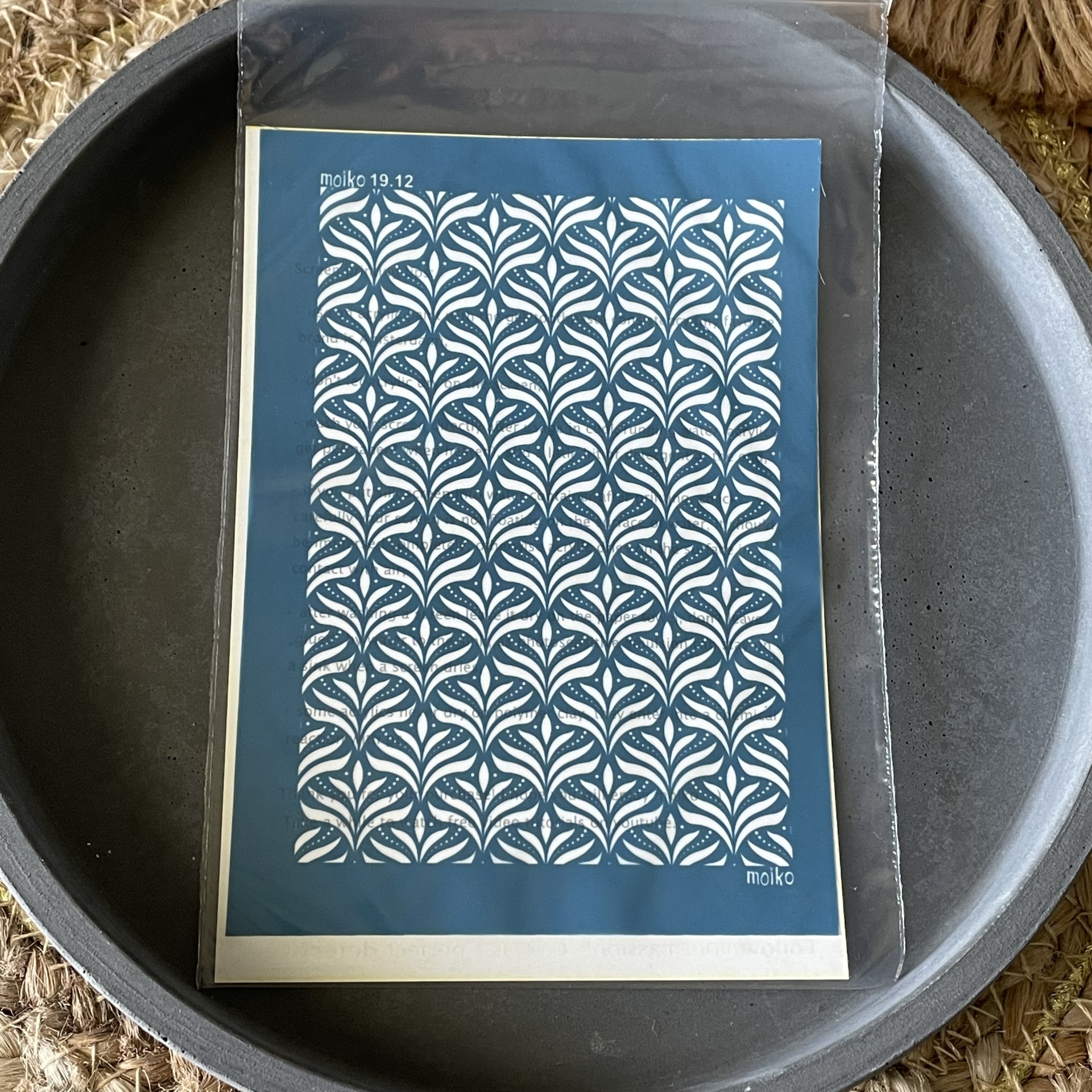 - esticar um rectângulo de cerâmica plástica com uma espessura homogénea - colocar o silk screen sobre a massa e pressionar gentilmente sobre toda a superfície (a parte mais brilhante deve ficar virada para baixo, a inscrição "Moiko" deverá estar legível e não em espelho) - numa das extremidades colocar um pouco de tinta acrílica (idealmente deverá ter uma consistência mais grossa tipo gel ou pasta de dentes) - esticar a tinta por toda a superficie com a ajuda de uma espátula ou cartão de crédito antigo - retirar o excesso de tinta - remover o silk screen cuidadosamente - lavar imediatamente o silk screen sob água corrente. Não utilizar nenhum tipo de escova ou produto que o possa danificar. - secar o silk screen com a ajuda de papel absorvente ou uma toalha