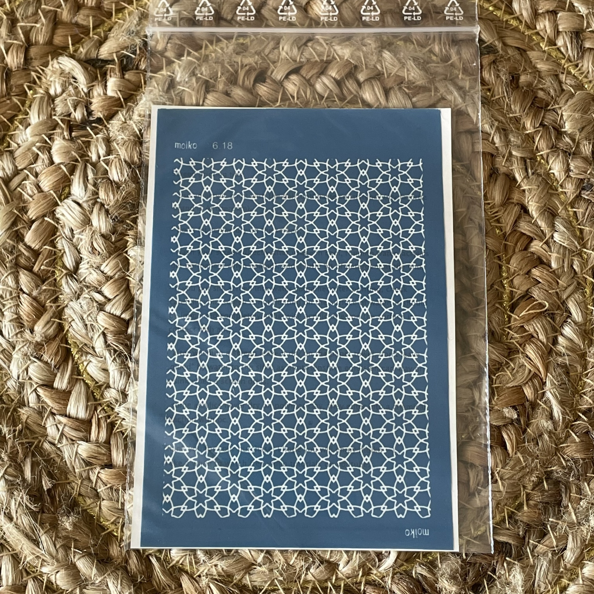 Padrão branco em fundo azul dentro de saco plástico sobre superfície de fibra natural
