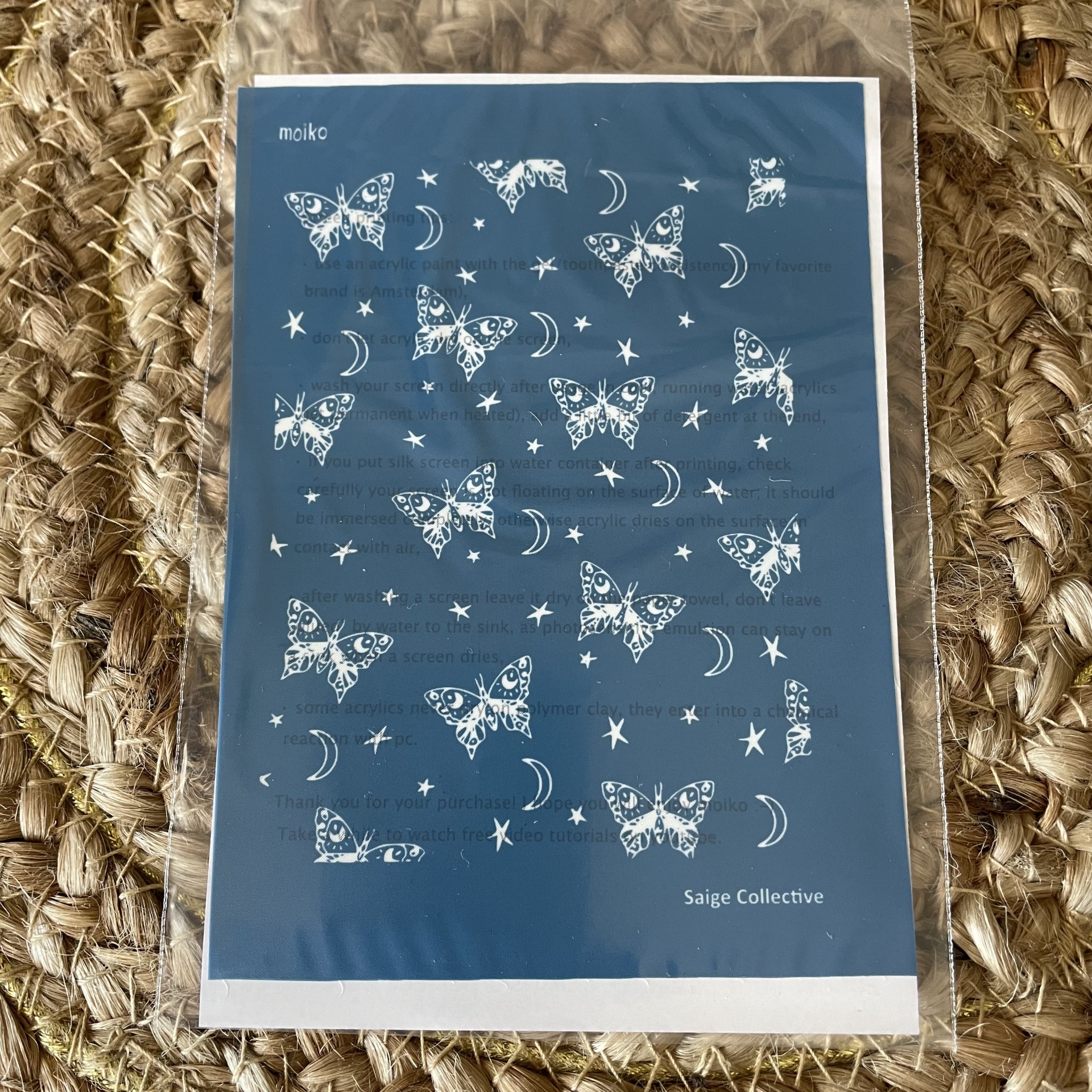 - esticar um rectângulo de cerâmica plástica com uma espessura homogénea - colocar o silk screen sobre a massa e pressionar gentilmente sobre toda a superfície (a parte mais brilhante deve ficar virada para baixo, a inscrição "Moiko" deverá estar legível e não em espelho) - numa das extremidades colocar um pouco de tinta acrílica (idealmente deverá ter uma consistência mais grossa tipo gel ou pasta de dentes) - esticar a tinta por toda a superficie com a ajuda de uma espátula ou cartão de crédito antigo - retirar o excesso de tinta - remover o silk screen cuidadosamente - lavar imediatamente o silk screen sob água corrente. Não utilizar nenhum tipo de escova ou produto que o possa danificar. - secar o silk screen com a ajuda de papel absorvente ou uma toalha
