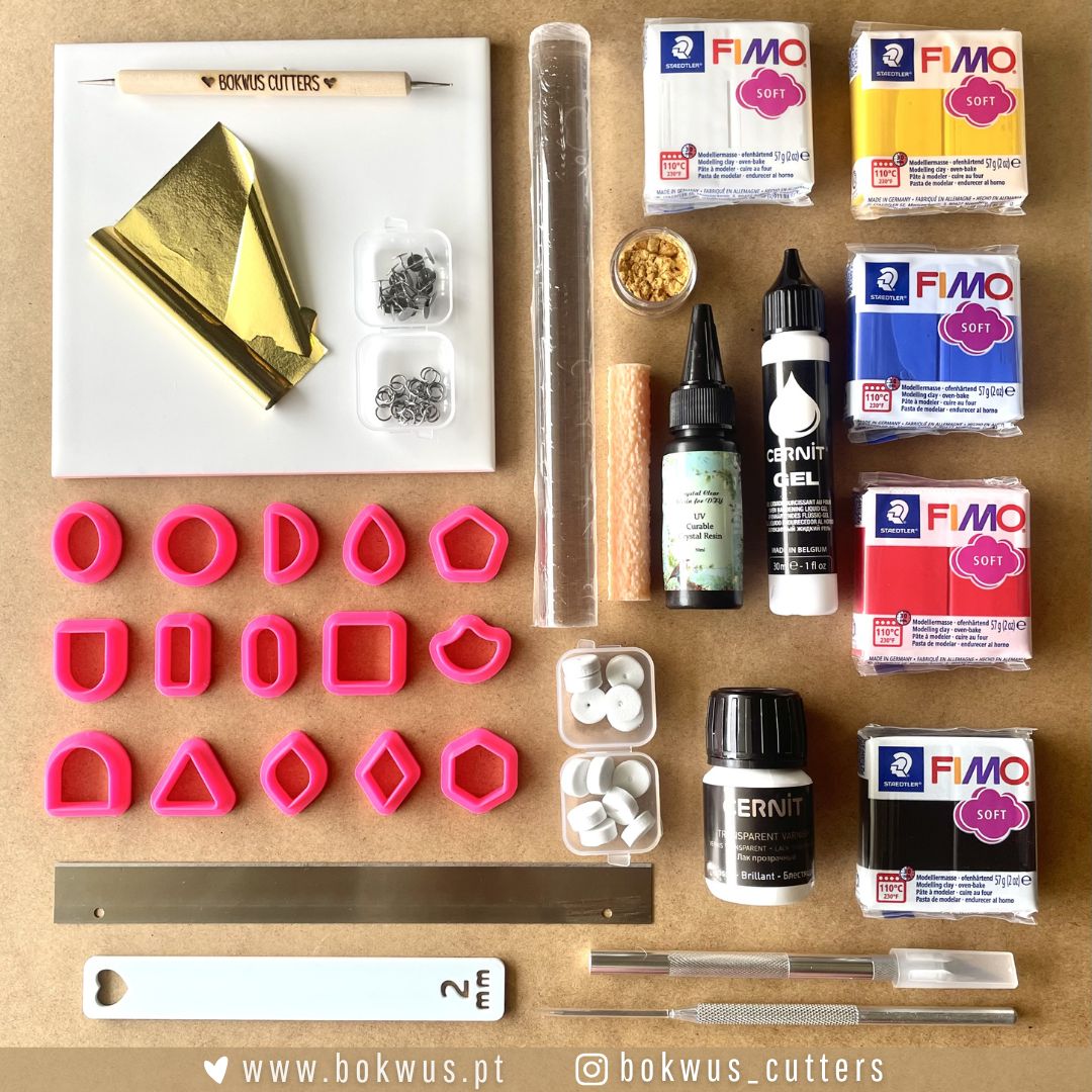 Starter Kit PRO - Kit de iniciação PRO 69,00 € Desconto de %. IVA incluído. Partilhar Compra este produto e ganha 69 Pontos! Saber mais Comprar Contactar 1 unidades em stock O kit de iniciação PRO inclui: •5x Cores básicas de FIMO (branco, preto, vermelho indiano, azul brilhante e amarelo girassol) •15x Cortadores •1x Rolo de acrílico •1x Bisturi •1x Boleador•1x Agulha para esculpir •1x Lâmina de corte •1x Azulejo •10x Protetores para brincos•30mL Resina UV •1 Par guias de altura 2mm •10x Folhas de ouro •1x Mini rolo de textura HD •10x Bases de brincos •20x Argolas•30ml Verniz brilhante•30ml Cernit Gel•1x Pó de mica dourado•1x Escovinha de limpeza Também disponível:STARTER KITATENÇÃO: A reserva dos KITS é válida por 24 horas. Caso o pagamento não seja efectuado nesse período a encomenda será cancelada.A marca de resina e as cores dos cortadores, bisturi e guias de altura poderão não corresponder às das fotos! Marca Bokwus Cutters Tags caixa temáticacaixacerâmica plásticastarter kitkitstarterkit de iniciaçãofimonovidadestarter kit prokit de iniciação pro Características