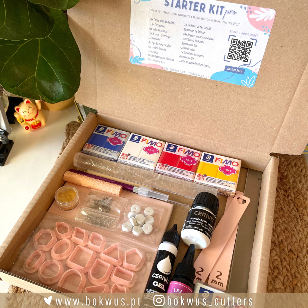 Starter Kit PRO - Kit de iniciação PRO 69,00 € Desconto de %. IVA incluído. Partilhar Compra este produto e ganha 69 Pontos! Saber mais O produto encontra-se sem stock. O kit de iniciação PRO inclui: •5x Cores básicas de FIMO (branco, preto, vermelho indiano, azul brilhante e amarelo girassol) •15x Cortadores •1x Rolo de acrílico •1x Bisturi •1x Boleador•1x Agulha para esculpir •1x Lâmina de corte •1x Azulejo •10x Protetores para brincos•30mL Resina UV •1 Par guias de altura 2mm •10x Folhas de ouro •1x Mini rolo de textura HD •10x Bases de brincos •20x Argolas•30ml Verniz brilhante•30ml Cernit Gel•1x Pó de mica dourado•1x Escovinha de limpeza Também disponível:STARTER KITSTARTER KIT MINIATENÇÃO: A reserva dos KITS é válida por 24 horas. Caso o pagamento não seja efectuado nesse período a encomenda será cancelada.As cores dos cortadores e guias de altura poderão não corresponder às das fotos! Marca Bokwus Cutters Tags caixa temáticacaixacerâmica plásticastarter kitkitstarterkit de iniciaçãofimonovidadestarter kit prokit de iniciação pro Características